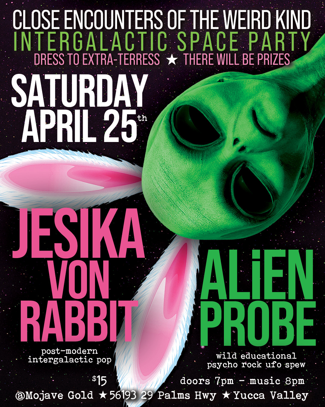 Queen of the High Desert Jesika Von Rabbit and local space psych-os Alien Probe join forces for an intergalatic space party that is sure to be out of this world! Get your weird on and dress to extra-terres, there will be prizes for the best and wildest outfits. Bound to be an unforgettable evening of alien eye candy, space stories, drinking and dancing, this night of close encounters of the weird kind is not to be missed.