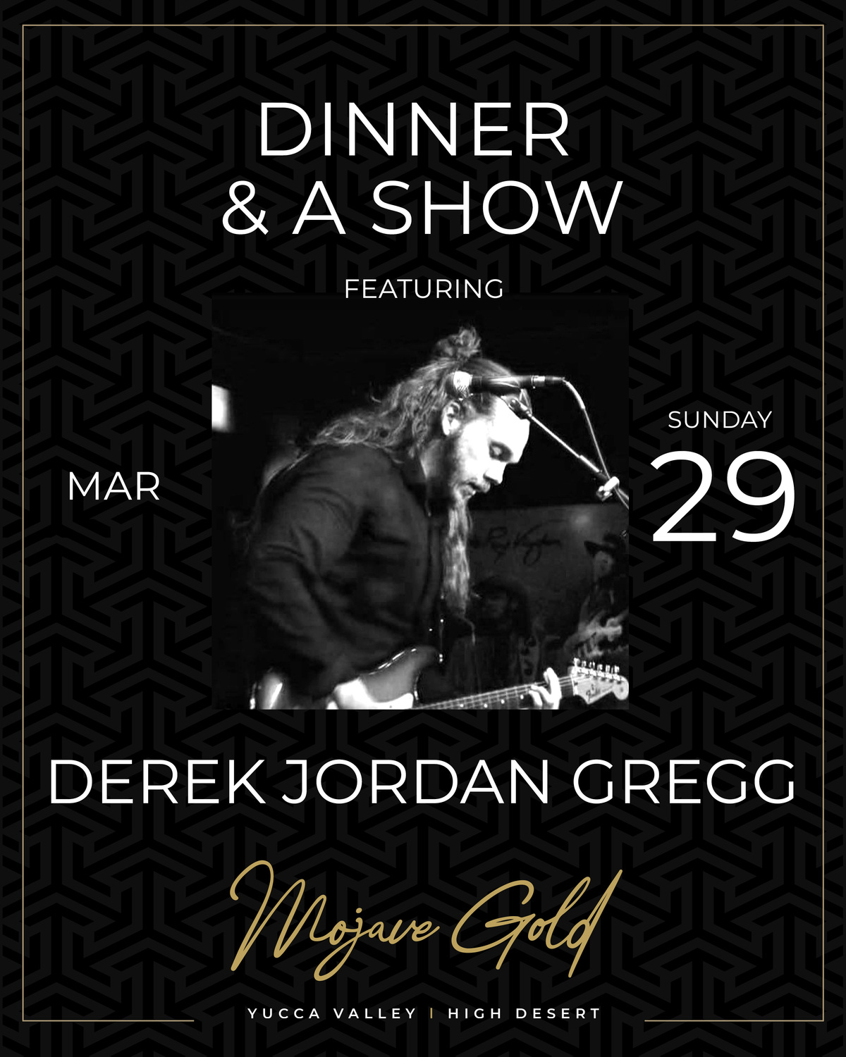 Sunday the beloved Dinner & a Show returns featuring Derek Jordan Gregg. Our music venue will be set up for a full dinner. Seats are limited, reservations recommended. www.mojavegolddesert.com