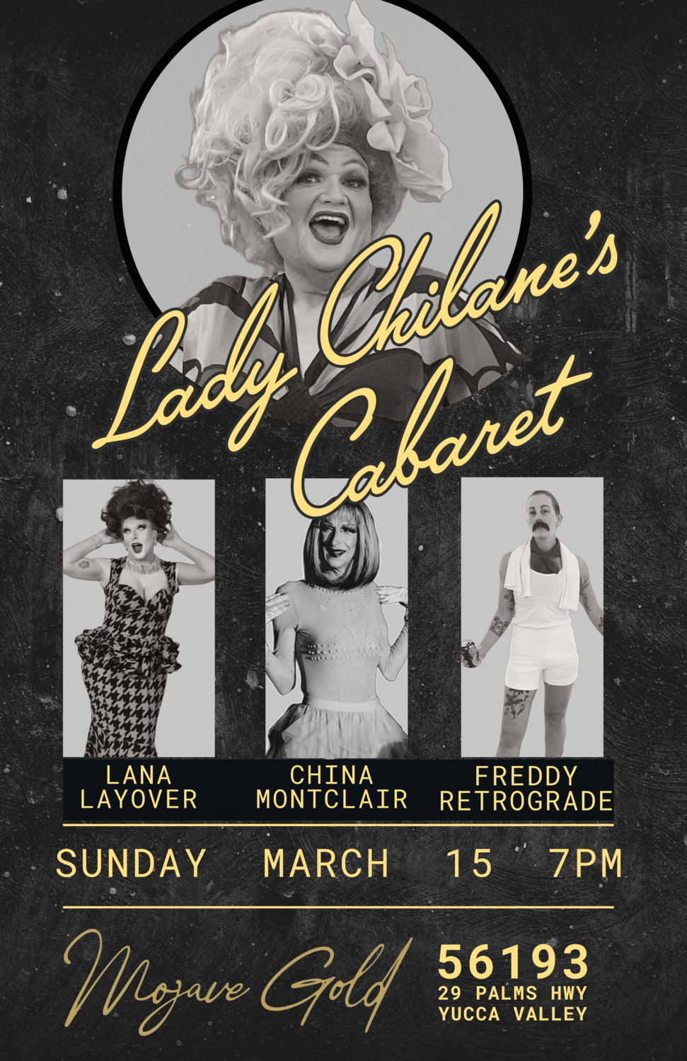 Join us for an unforgettable night of glamour, live performance, and desert decadence at Lady Chilane’s Cabaret — returning to Mojave Gold on Sunday, March 15 at 7PM.